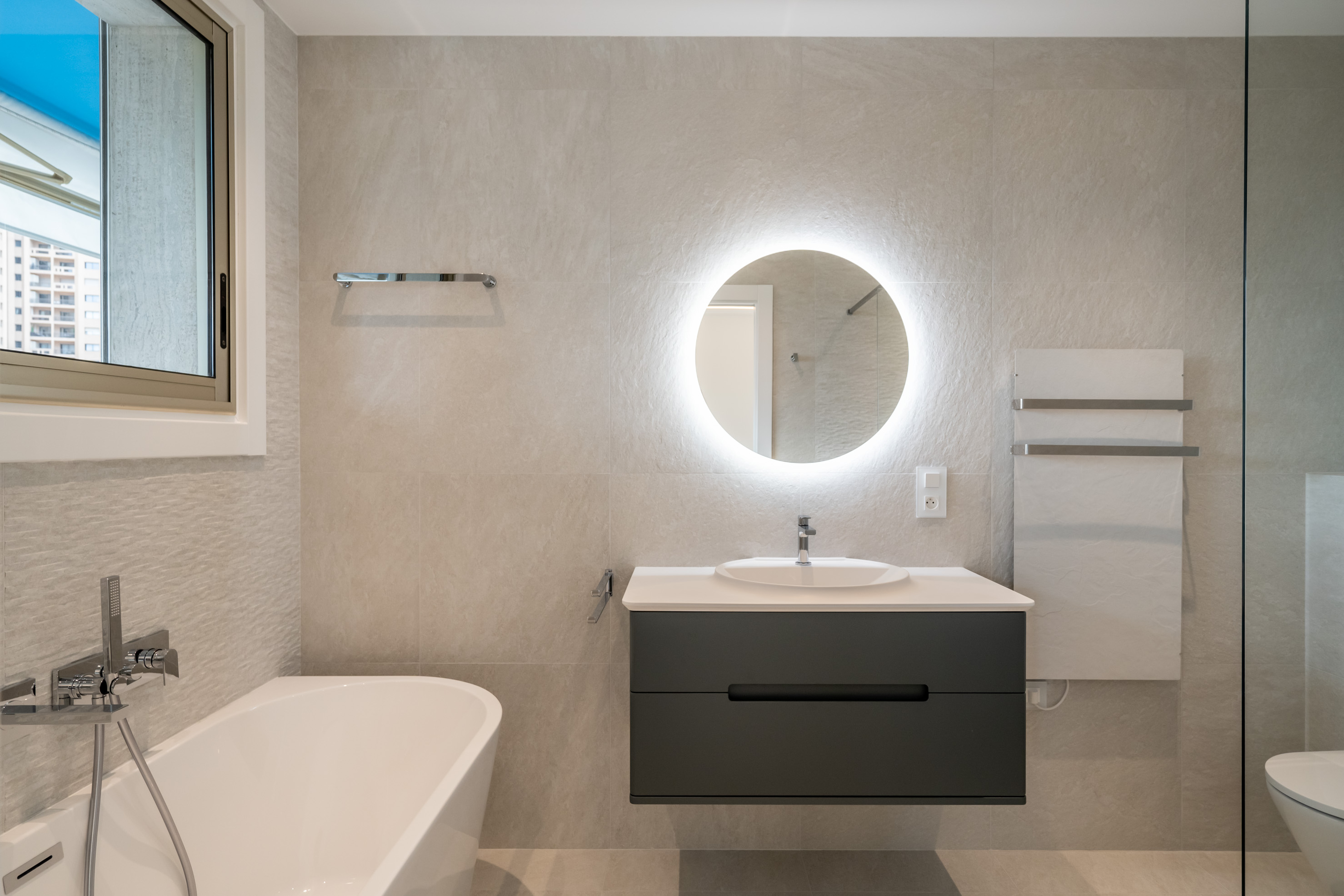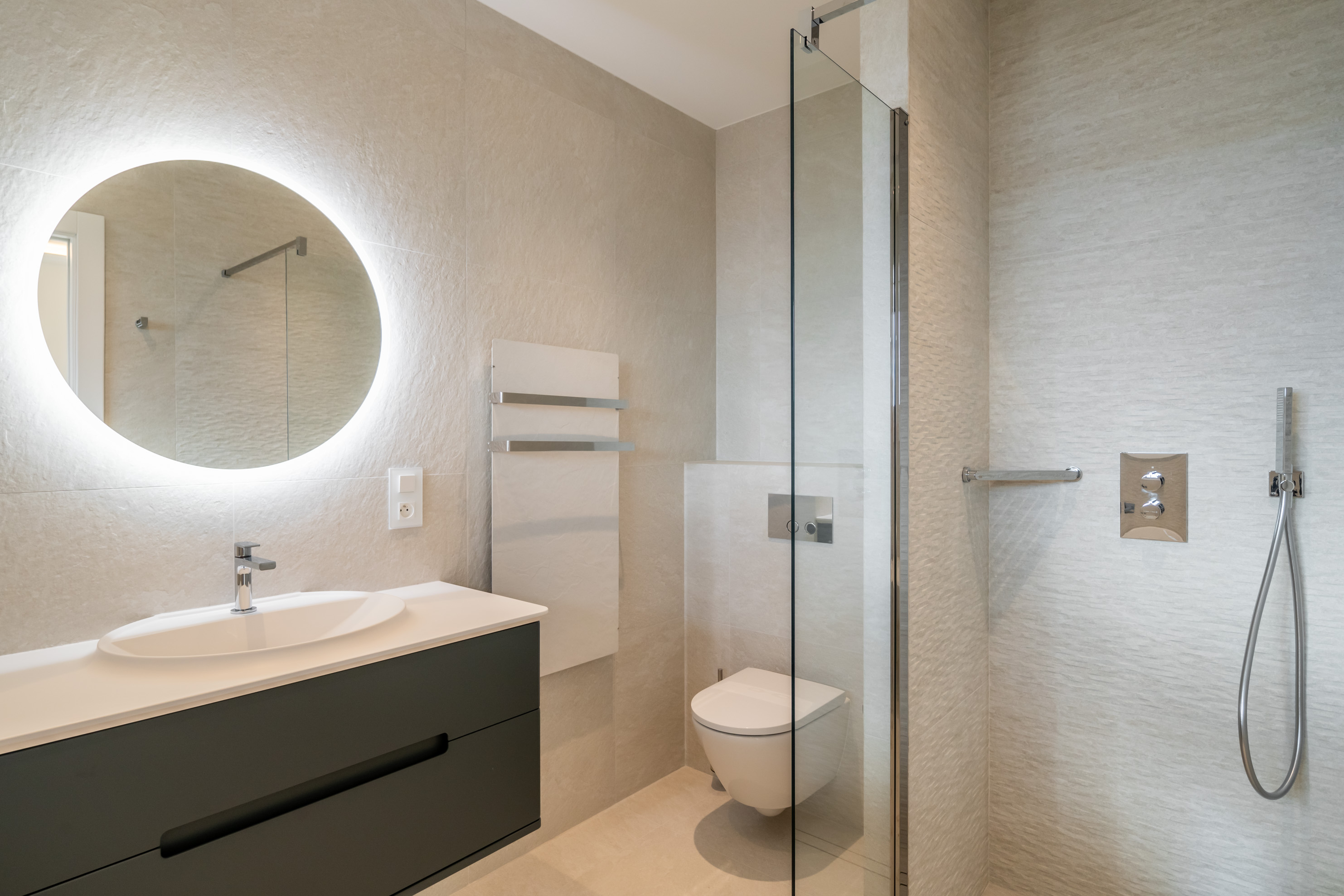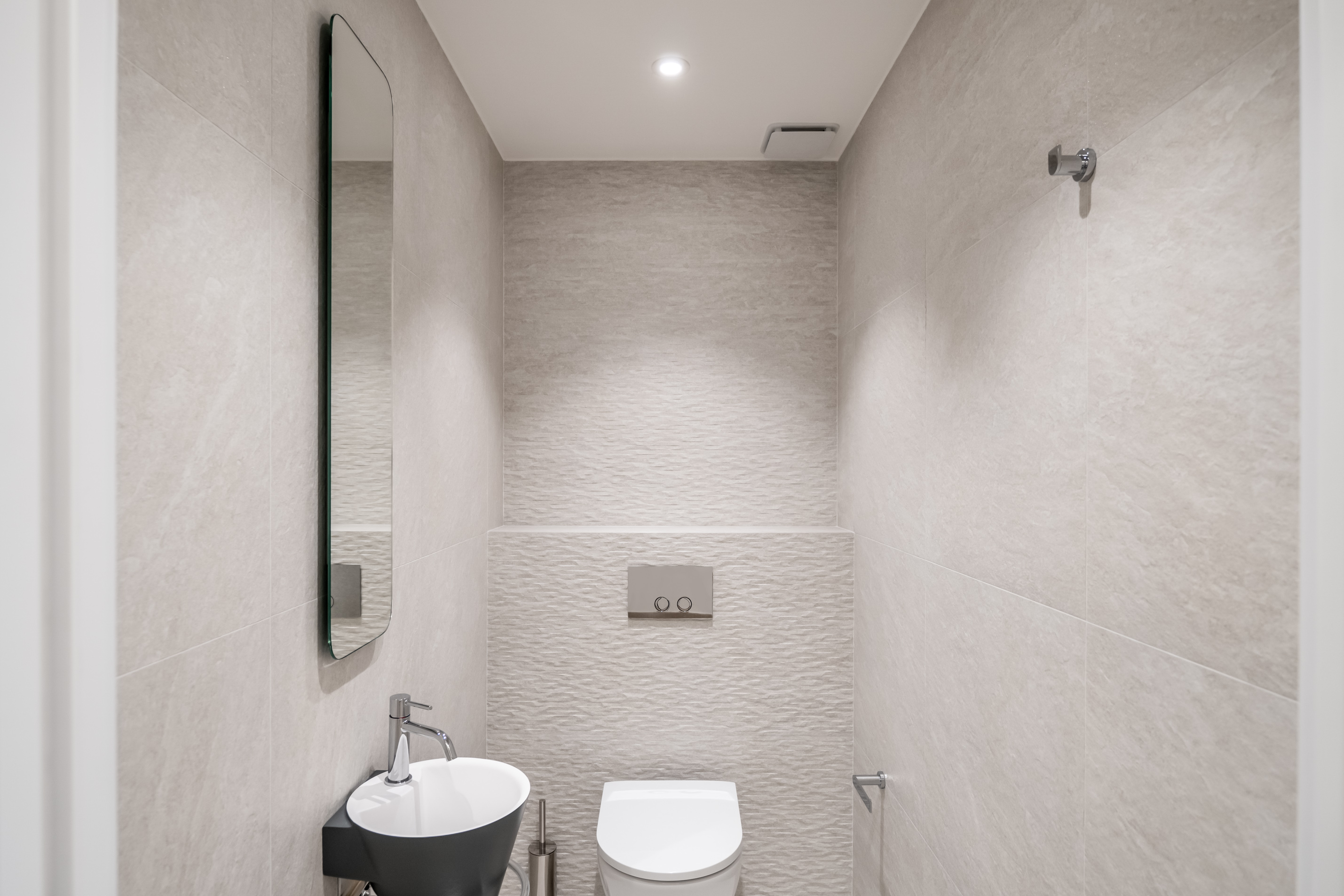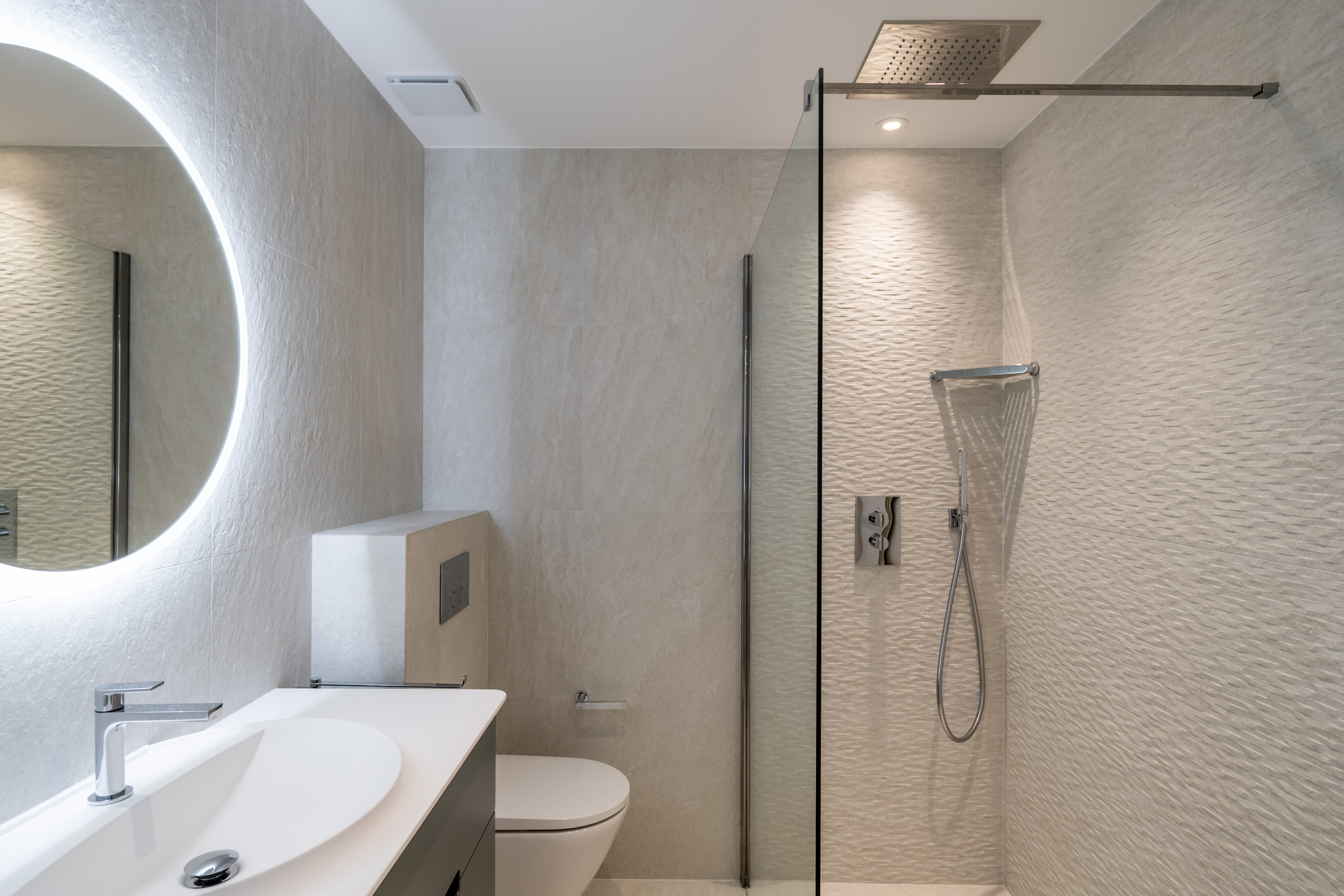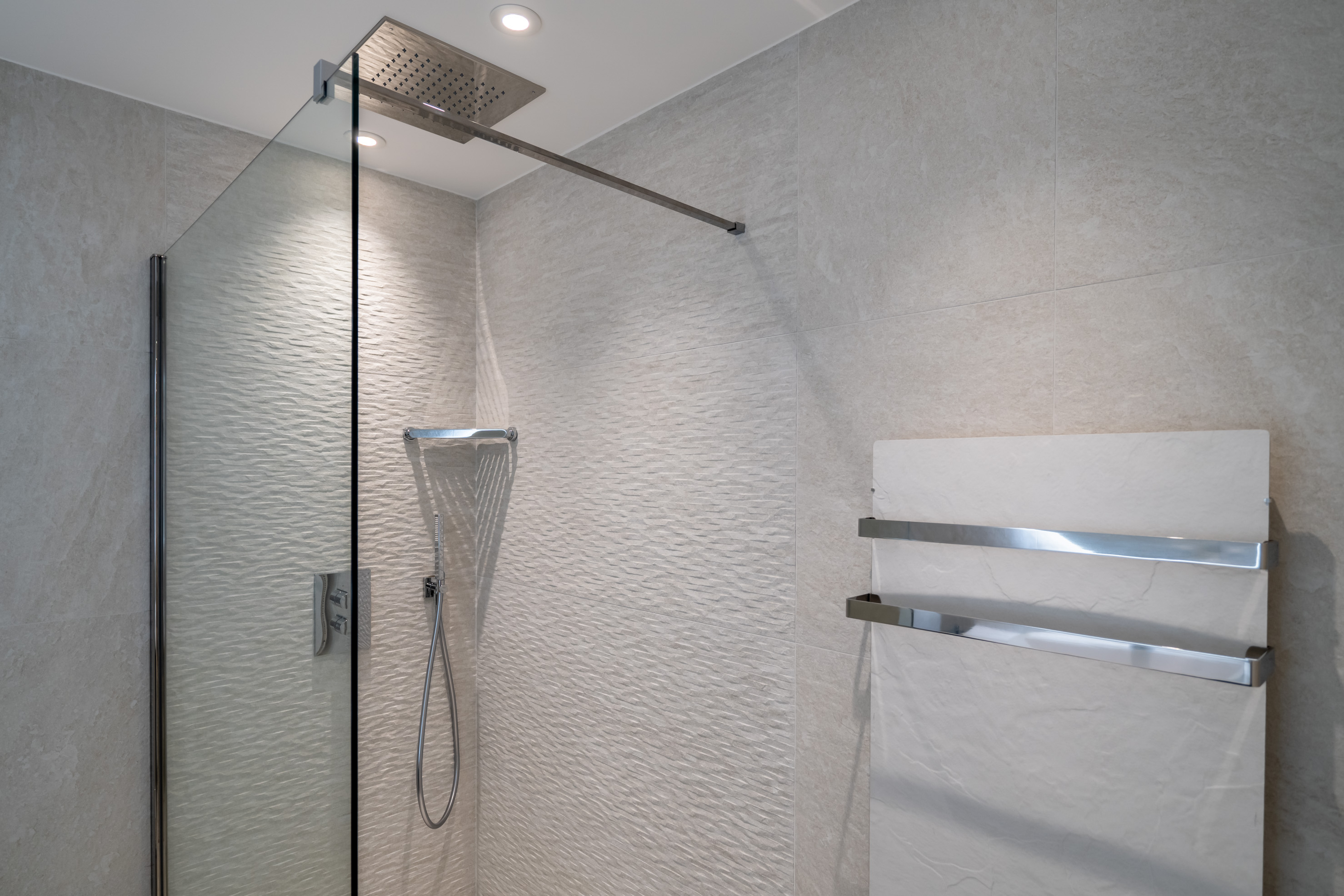 Démolition et curage complet, reprise des ouvrages de maçonnerie, réalisation des chapes, mise en œuvre des réseaux sanitaires, des installations de chauffage, climatisation et aéraulique, ainsi que des installations électriques CFO/CFA, puis pose des revêtements durs (carrelage, pierre) et des revêtements souples.